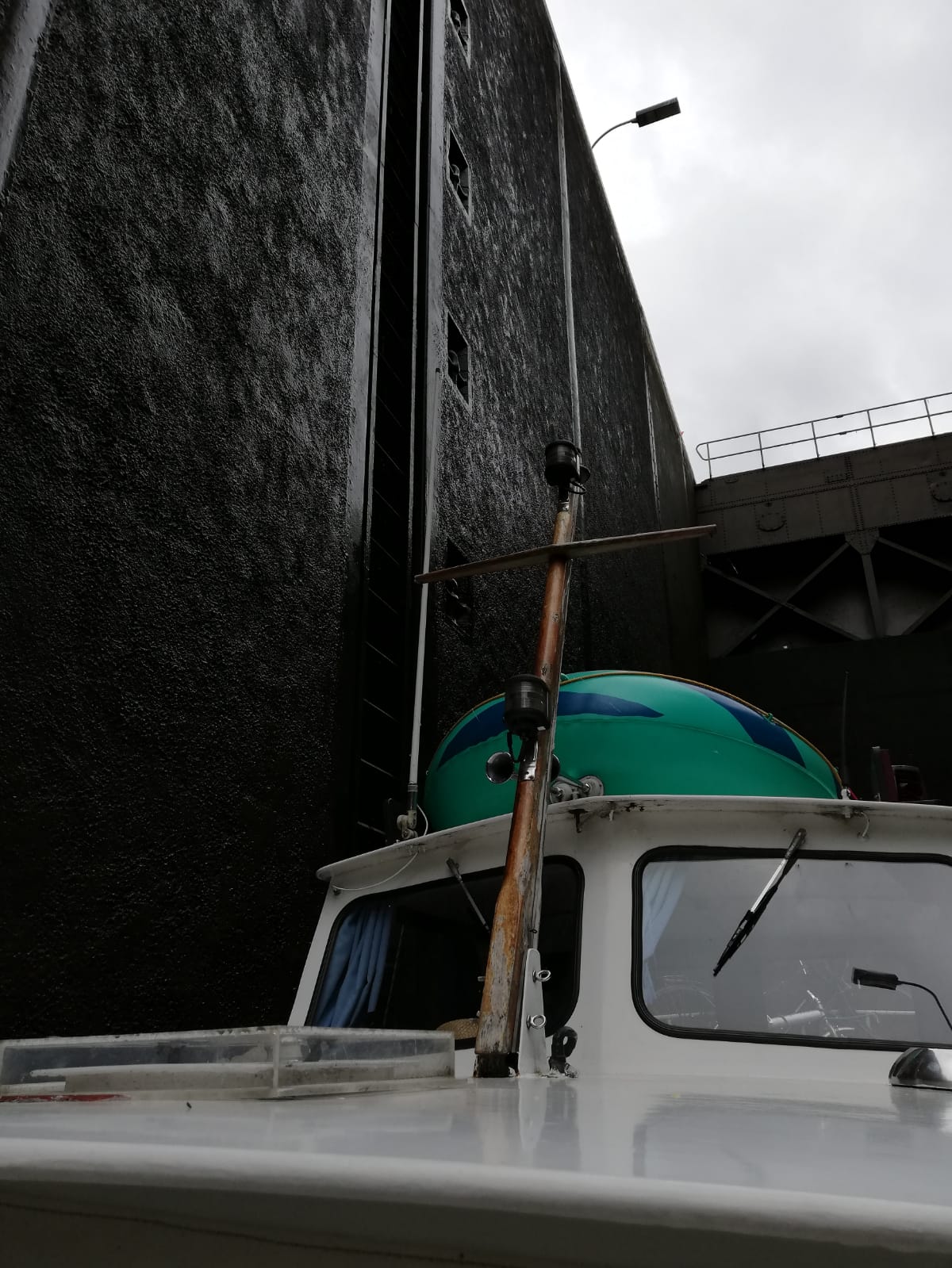 Mit Muschelspucke durchnässtes Boot verlässt die Schleuse. Schande!